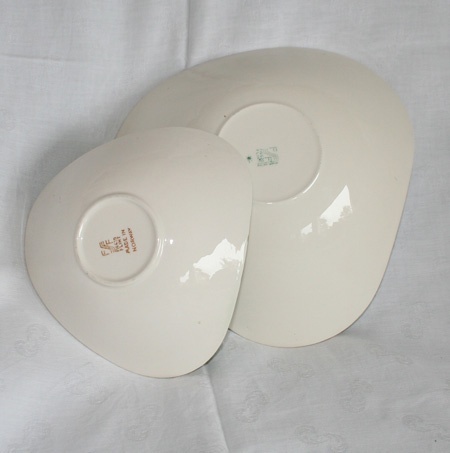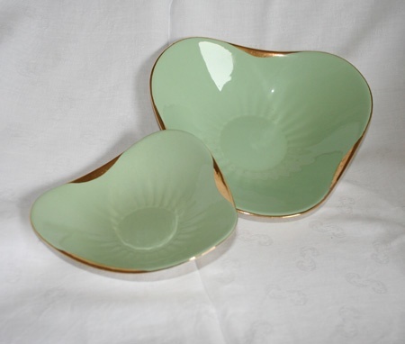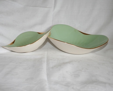 To nydelige grønne fat med gullkant. Fatene er hvite på utsiden. 22 og 16 cm i diameter.