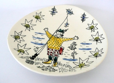 Lite fat med motiv av en glad fisker -håndmalt av Inger Waage i typisk naivistisk stil :) Stavangerflint.