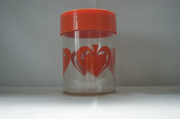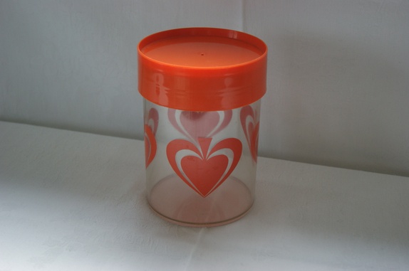 Søkeord: retro, boks, plast, plastikk, plastboks, hjerter, lokk, oppbevaring, orange, oransj, oransje