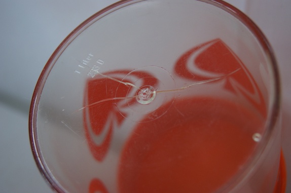 1 liters plastboks med oransje hjerter. Oransj lokk. I bunnen på boksen er det noen brester i plastikken. Boksen er 15 cm høy.
