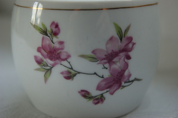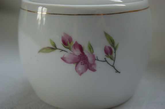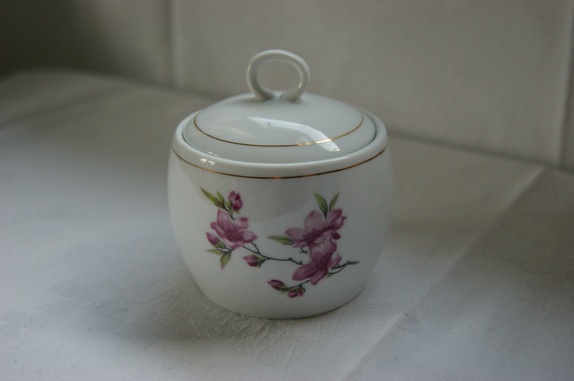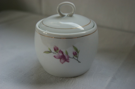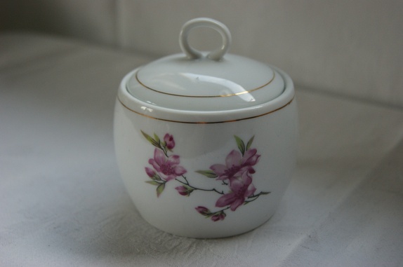 Sukkerskål med lokk. Nydelige rosa blomster på skålen. høyde 9 cm med hanken.
