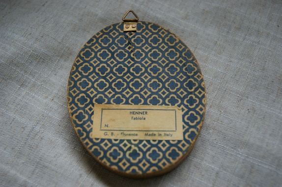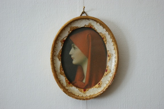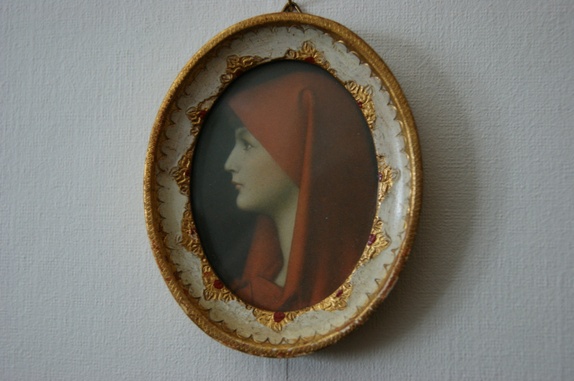 Ovalt lite bilde i treramme. Bildet er en reproduksjon av Henner, Fabiola. Nydelig treramme som ser ut til å være håndmalt. På baksiden står det: HENNER Fabiola, made in Italy. (se bilder)