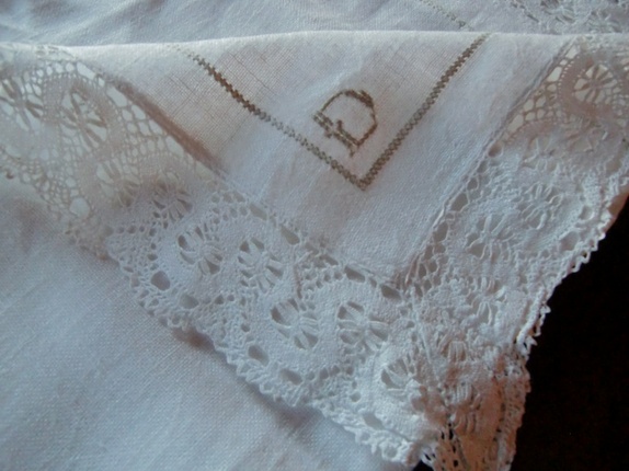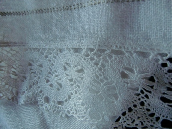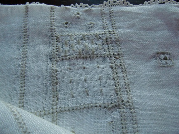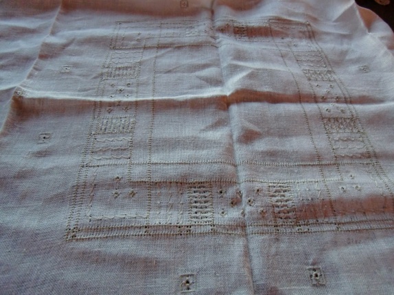 Brodert, gammel linduk m/ nydelig bård på 6 cm bredde rundt hele duken og monogram i ene enden. Litt tynnere lin, ikke den kraftige sorten.