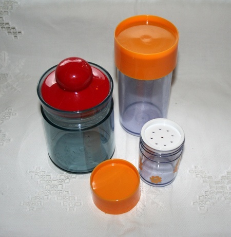 Den minste boksen er helt ubrukt. Den måler 8 cm. Det er en sukkerdrysse, med strølokk under det gule lokket.