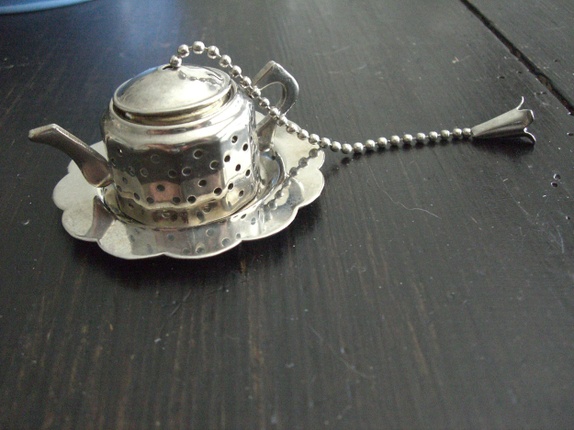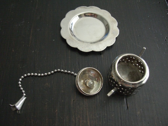 Denne er kjempesøt! Nesten 3 cm høy. følger med et lite fat.Går nok akkurat en teskje med te oppi denne,så er det bare å senke den ned i koppen...eller ha den som pynt! Har prøvd å pusse den,tror den er forsølvet...på en måte.ble iallefall blankere med sølvpuss og kluten ble svart:)