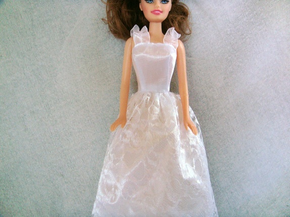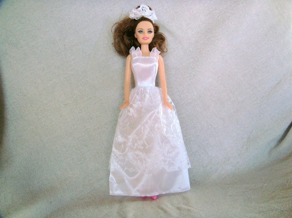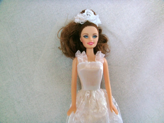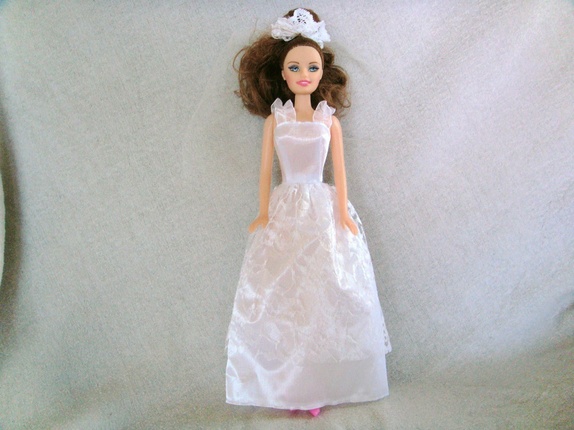 Brudekjolen til barbie har borrelås bak og har blonde stoff fra livet og ned foran..Sløret har strikk og er i tyll med blonde foran..