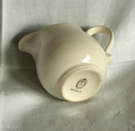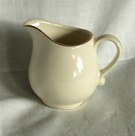 Liten fløtemugge, ca. 8 cm høy. Gullkant og gull på hanken. Merke Stavangerflint