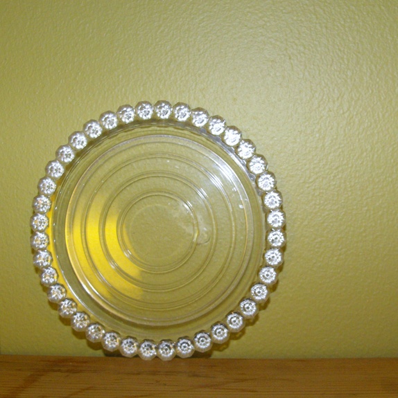 8 brikker laga i gjennomskinleg plast. 2 blå, 1 grøn og 5 blanke.Ein fin kant rundt som kan minne om "diamantar". Ca 8 cm diameter, frå kant til kant og ca 6 cm i diameter innerst.