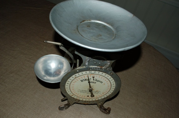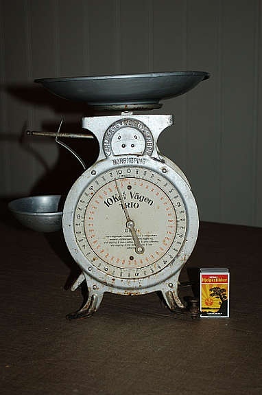 Gammel stor svensk 10 kg kjøkkenvekt fra Carlbergs Verktygsfabrik i Norrköping, Sverige.