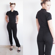 90-talls glitrende bodysuit, one-piece med glitter, sort drakt med røde glittertråder