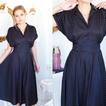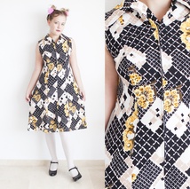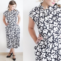 50% aprilSALG Sort hvitt kjole fra 80-tallet, abstrakt blomstermønster, hvite knapper, sommerkjole