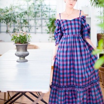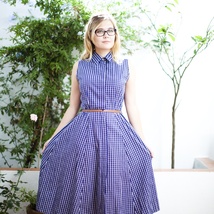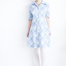 50% aprilSALG 70-talls rutete kjole, blå grønn og hvit-mønstret sommerkjole