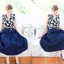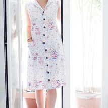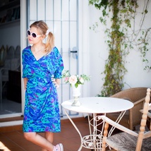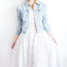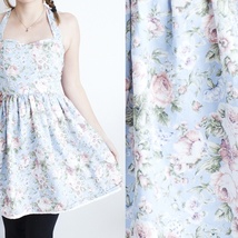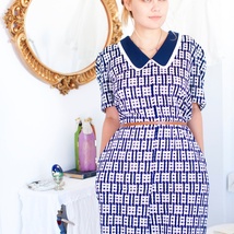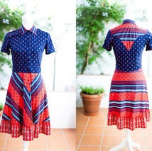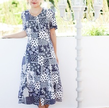 Vintage blå hvit kjole med nydelig miks av blomster, prikker, abstrakt mønster. Minner meg om en porselenstalerken!