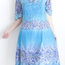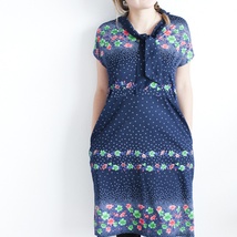 50% aprilSALG 70-talls blå kjole, prikkete og blomstrete, grønne detaljer, kjole med sløyfe
