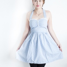 Blå prikkete kjole, pin-up minikjole, halter neck