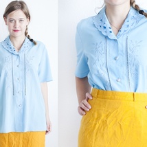 80-talls blå bluse, blondebluse, sommerbluse, korte ermer, perleknapper, skjorte