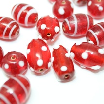 Lekre røde glassperler med hvit pynt - Lampworkperler