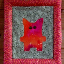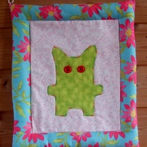 Tekstilbilde: grønt monster m/blomstrete ramme