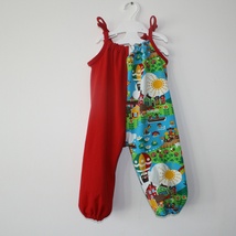 Baggybukse, rød m hvite blomster, str 3 år *SALG*