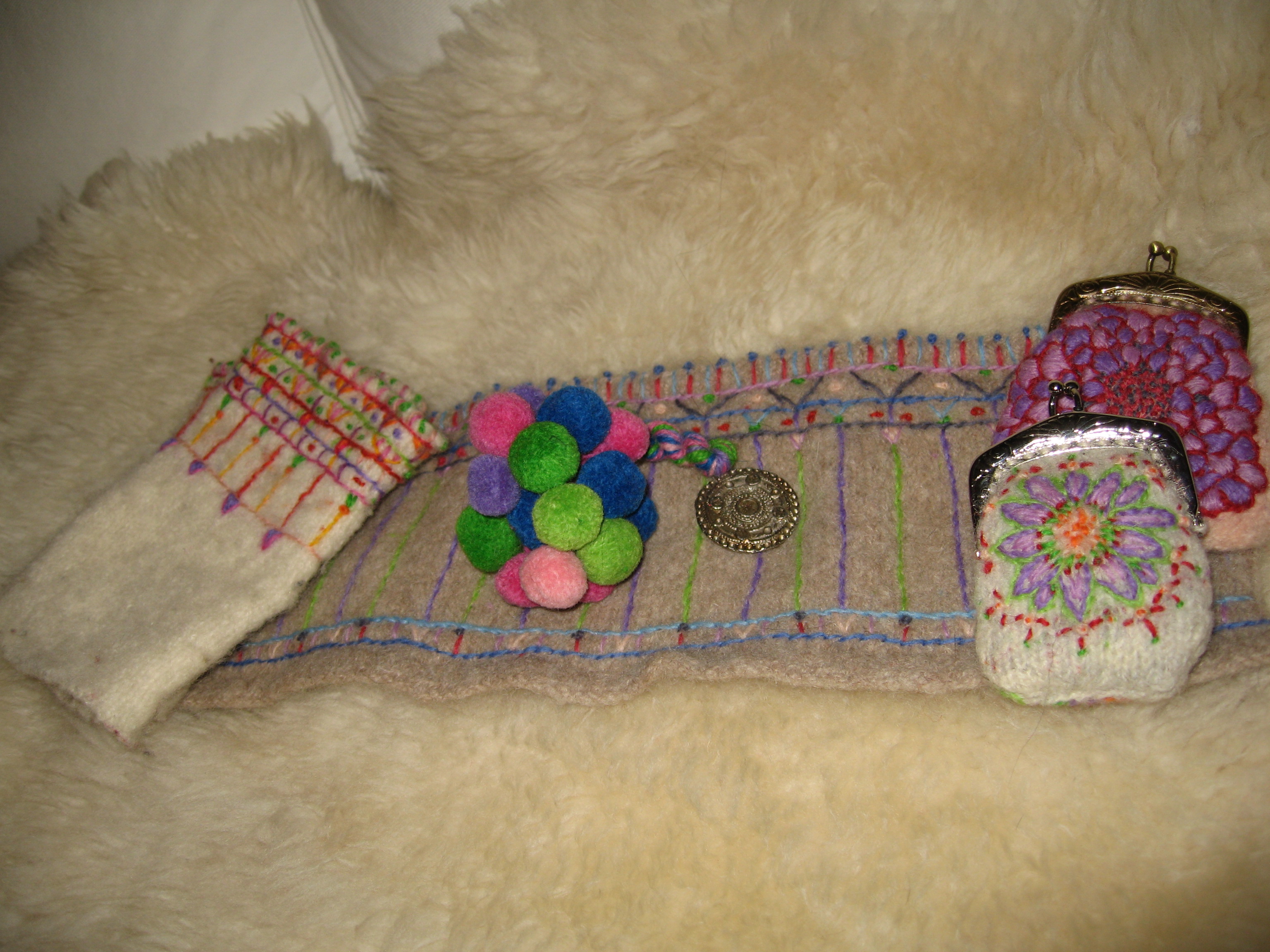 Fargerike håndlagede ull produkter i egen design:PortemoneerSkjerfPulsvanter/vanterNøkkelknipperSokker