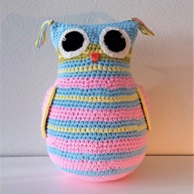 SALG - Heklet ugle i lys blå, grønn, gul og rosa.