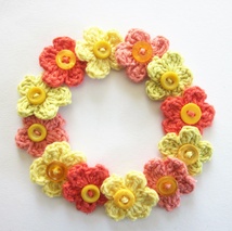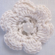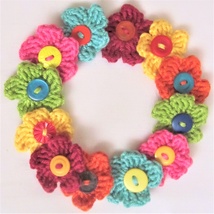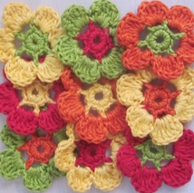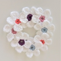 1 Sett med 8 hekla blomster i hvitt, lys blå, lilla, orange, rosa.