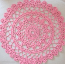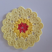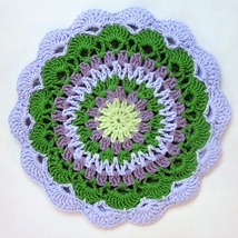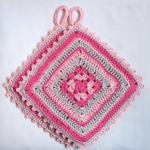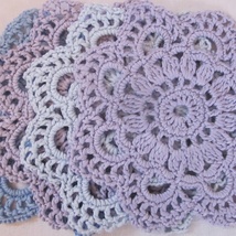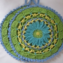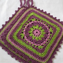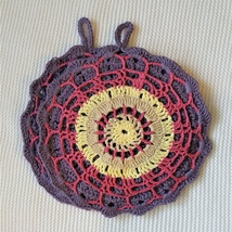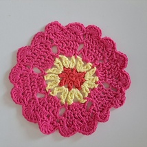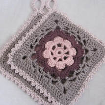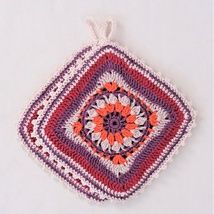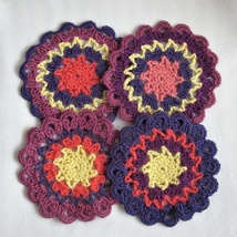 *SALG* Heklet gryteunderlag i lys rosa, rødlilla, rødrosa, sitrongul og lilla. FØR KR 175,-