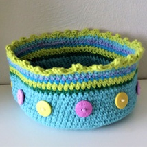 *JANUARSALG* Heklet kurv i blått m/to hanker og blomsterdekor. FØR KR 175,-
