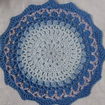 Heklet brikke /bordskåner, i blåfarger og lys lilla.