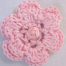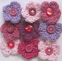 1 Sett med 9 hekla blomster i lys rosa, lilla og rosa.