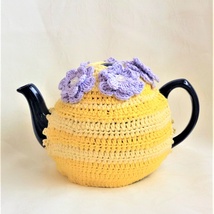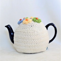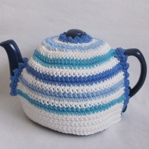 *SALG* Heklet tekannevarmer i turkis, hvitt og blått. FØR KR 200,-
