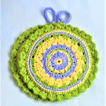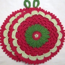 *JANUARSALG* 2 stk. runde hekla grytekluter ,doble, i rødt og grønt. FØR KR 250,-
