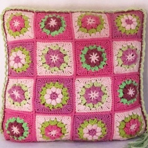 Heklet putetrekk i grårosa, rosa, kaki, støvet grårosa.