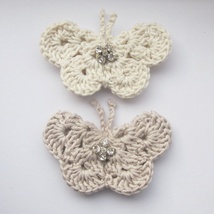 1 Sett med 4 hekla hjerter i hvitt og gull effektgarn.