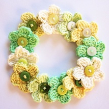 * SALG * Heklet brikke i gul, vårgrønn, lys blå, turkis.