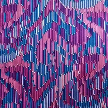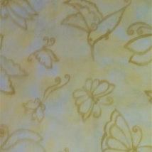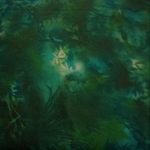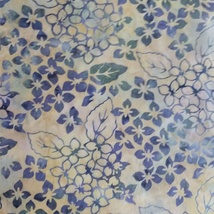 Batikkstoff, m/blomst- og bladmønster, i lilla, blå, blålilla, grønn på lys bunn.