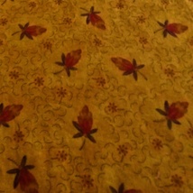 Bomullstoff/quiltestoff m/ gulbrune og grønne blader, mørk brune prikker på brun bunn.