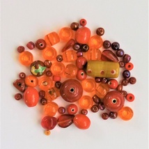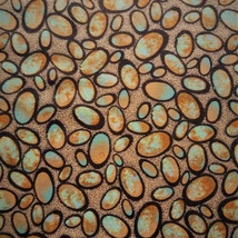 Bomullstoff/quiltestoff m/stein mønster på orange/sort prikkete bunn.