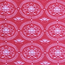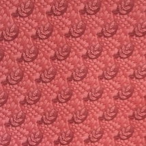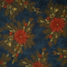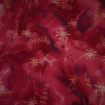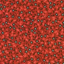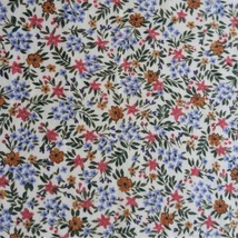 Bomullstoff/quiltestoff m/små blomster i lys blå og mørke grønn, blader/stengler i mørkegrønn, og rosa på rustrød bunn.