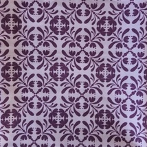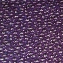 Bomullstoff/quiltestoff m/mønster i lys lilla, sort og blått på lilla bunn.