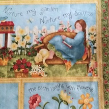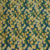 Bomullstoff/quiltestoff m/ gule påskeliljer, tulipaner, krokus, grønne blader på blå bunn.