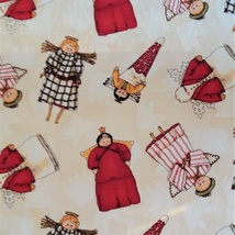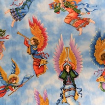Bomullstoff/quiltestoff m/engle figurer på lys, melert, bunn.