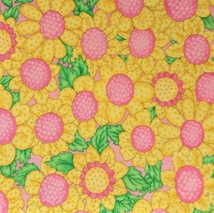 Bomullstoff/quiltestoff m/blomster og blader, i gul, rosa, grønn.
