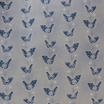 Salg - Bomullstoff/quiltestoff m/ blå fugler, lys blå kvister og hvite snøfnugg på lys blå bunn.