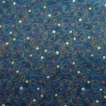 Bomullstoff/quiltestoff, engler, stjerner, sirkler, i gul/orange på blå, melert bunn.