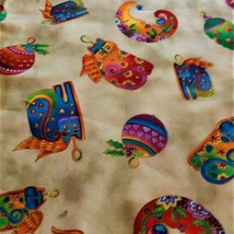 Bomulstoff/quiltestoff m/ juletrekuler, granbarkvister i gullfarge på naturfarget bunn.