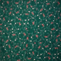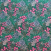 Bomullstoff/quiltestoff m/små blomster i rosa og hvitt, grønne blader og lys lilla stengler på grønn bunn.