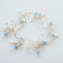 Unik håndlaget armbånd med bergkrystall stjerne, lys blå akvamarin, hvite kulturperler, klare og lys blå glass krystaller, med sølvbelagt tråd