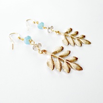 'Boho' øredobber med gullfarge blad charm, lyseblå stener, krystaller. FRI FRAKT