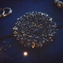 Håndlaget svart-gull brosje av tekstil